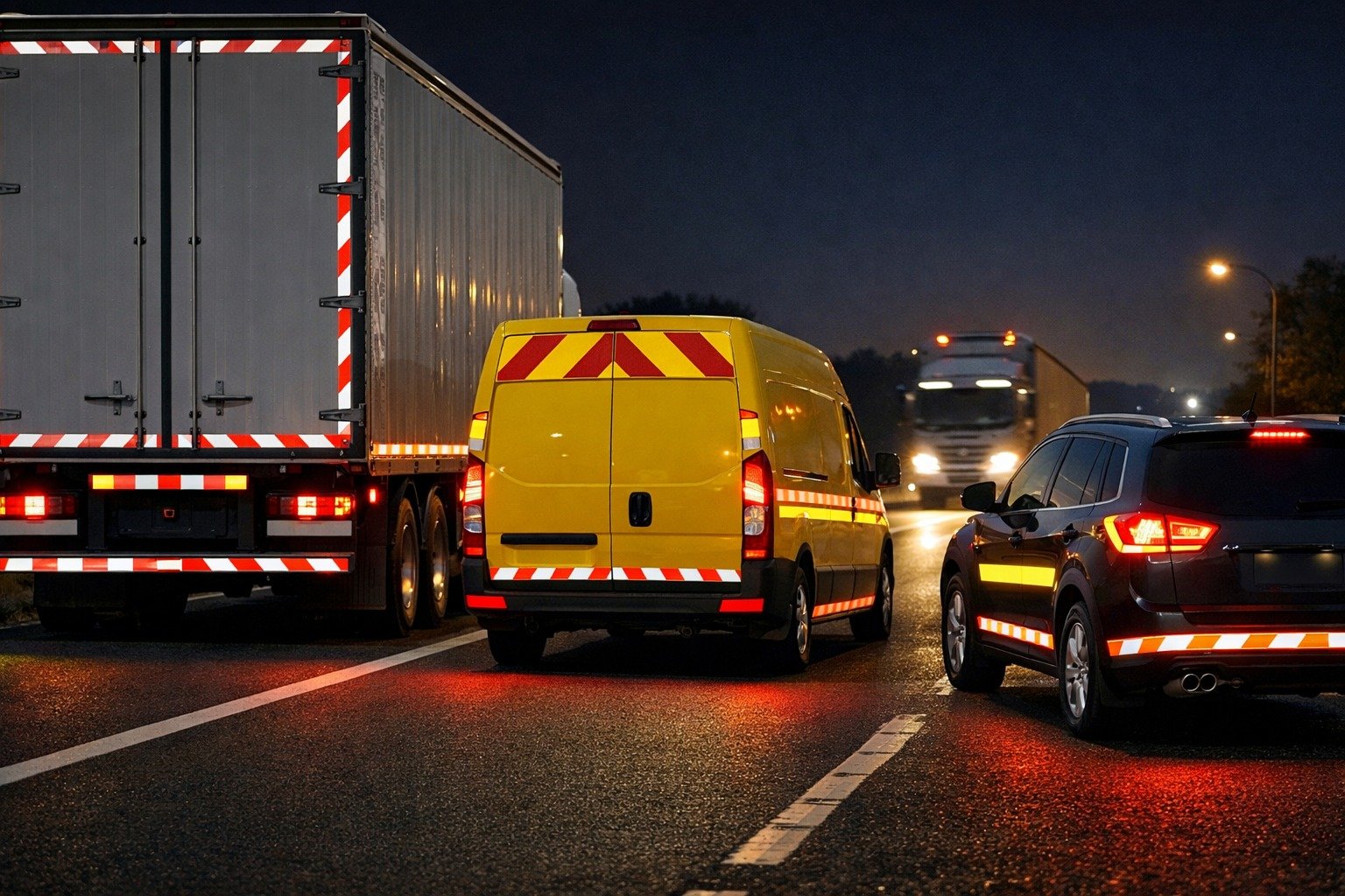 Effective reflective tape maintains clear color definition at night. High contrast patterns improve depth perception and vehicle outline recognition, which lowers the risk of rear-end and side-impact accidents.